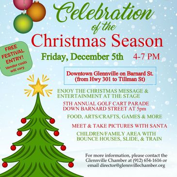 The holidays will be here soon and Glennville goes big every year with our Celebration of the Christmas Season downtown. Bring the whole family and come enjoy the local entertainment on stage, many foods & drinks, arts & crafts vendors, kid & family area, and be sure to stick around for the Friends of Glennwanis Golf Cart Parade. You might even see a special guest at the end of the parade and be able to get your picture taken with him!