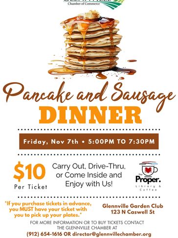 It already time again for our annual Pancake & Sausage Supper fundraiser. Whether you dine in, carry out, or use our convenient drive through option, we would love to provide dinner for you and your family. If you choose to dine in, we may even have a special surprise for you this year. Purchase your tickets now at the Glennville Chamber office, The Journal Sentinel Glennville office, or contact a Glennville Chamber Board member.