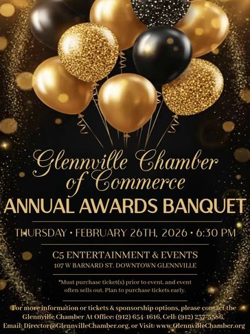 The moment our local businesses wait for every year... its almost time to see who won the coveted awards for 2025 at the annual Glennville Chamber Awards Banquet. Banquet will be hosted at C5 Entertainment & Events this year on Thursday, February 26th at 6:30 PM. Sponsorships and tickets are available NOW, and if you're already a Chamber member, be sure to check your email and submit your votes before February 6th!